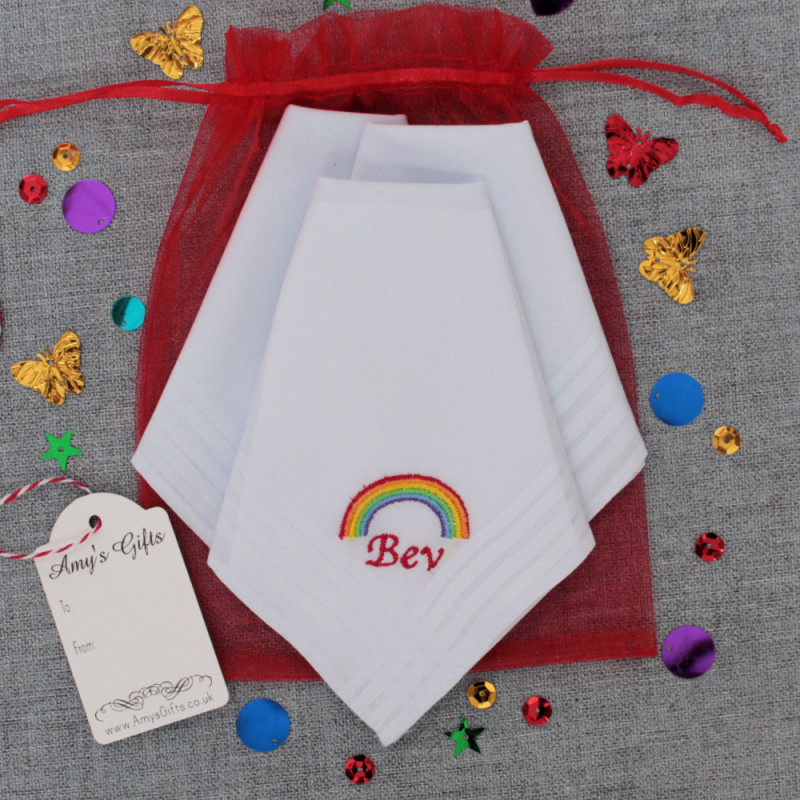 Cheerful rainbow motif personalised handkerchief gift set of 3. Lovely and colourful rainbow embroidered gift for Pride, Congratulations or Get Well.