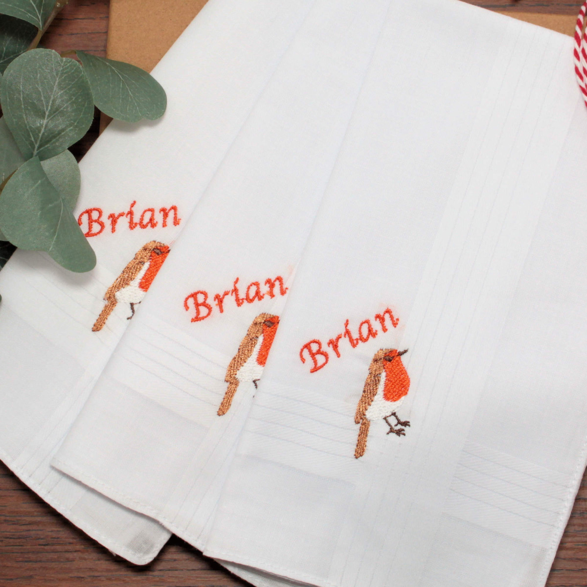 A unique and useful handkerchief gift for all ages. Makes a great Christmas gift with the robin motif embroidered on each hanky and any name or initials.
