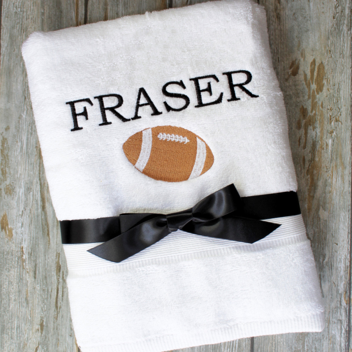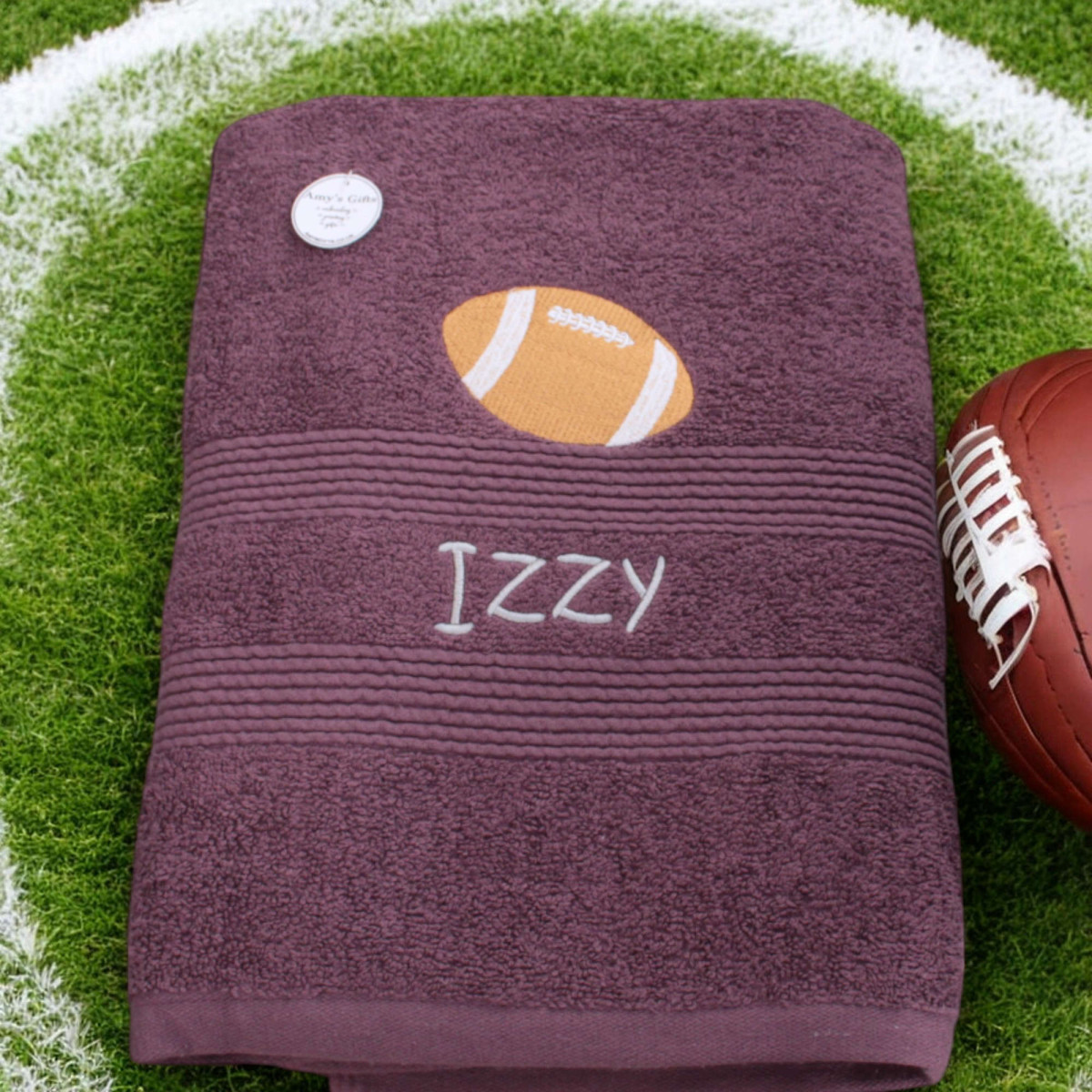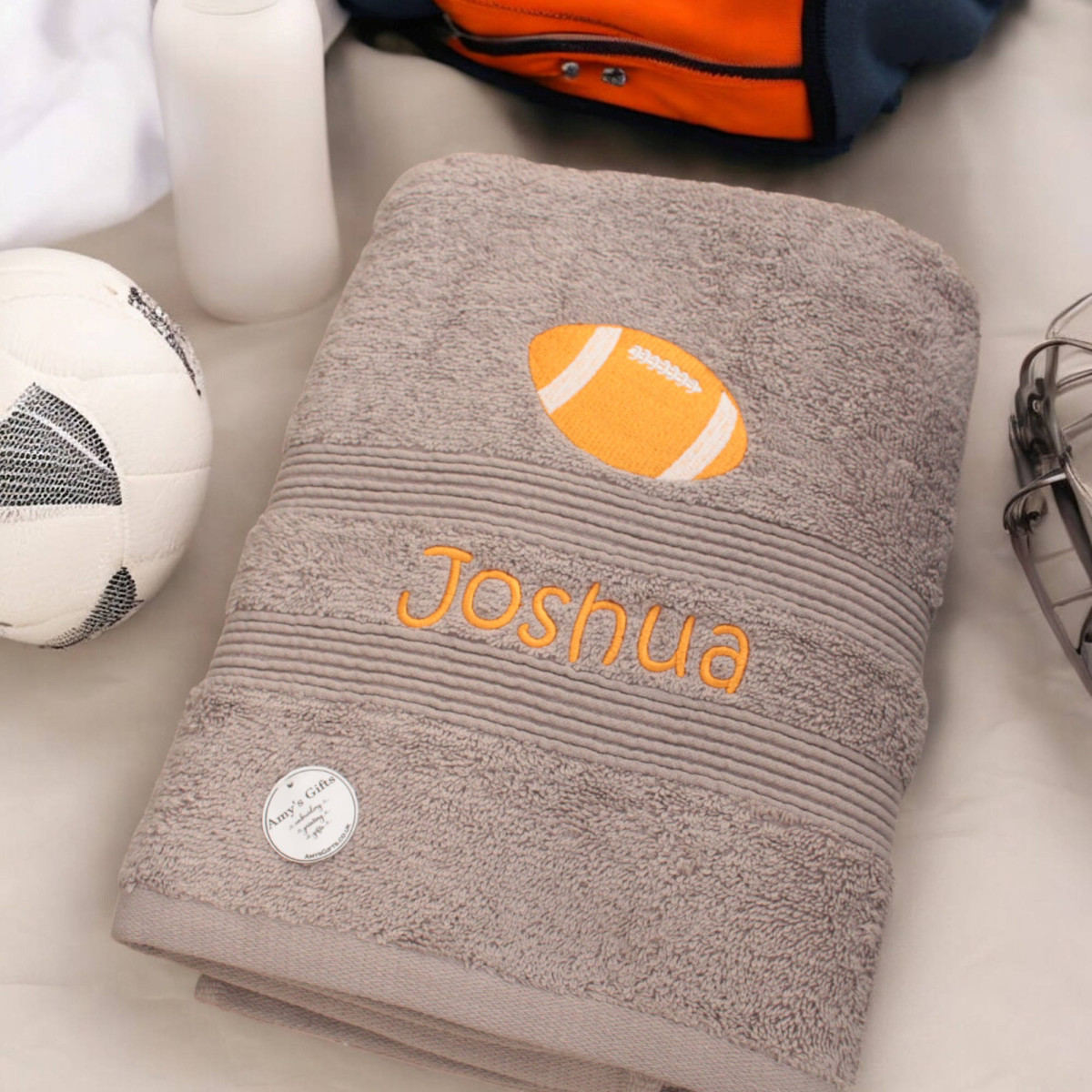 Rugby football embroidery personalised towel in your choice of size and a variety of towel colours to choose from. A cool gift for all sports fans. Personalised with your choice of name and the embroidered rugby ball motif. Please select from towel colours in the options and tell us what name and thread colour for the name to customise your embroidered towel with. Special made to order unique towel gift.