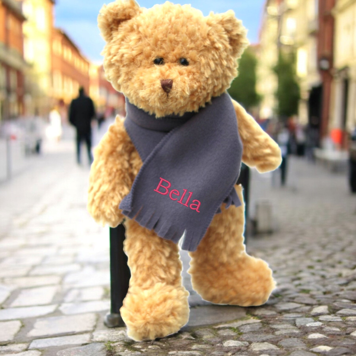 Adorable teddy bear wearing a cosy little scarf personalised with a name of your choice. Classic teddy in a soft winter