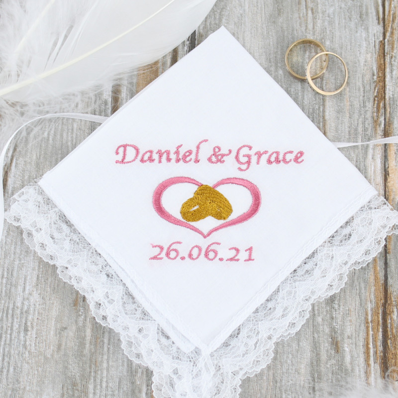 Wedding Handkerchief Personalised Heart and Rings Lace Hanky