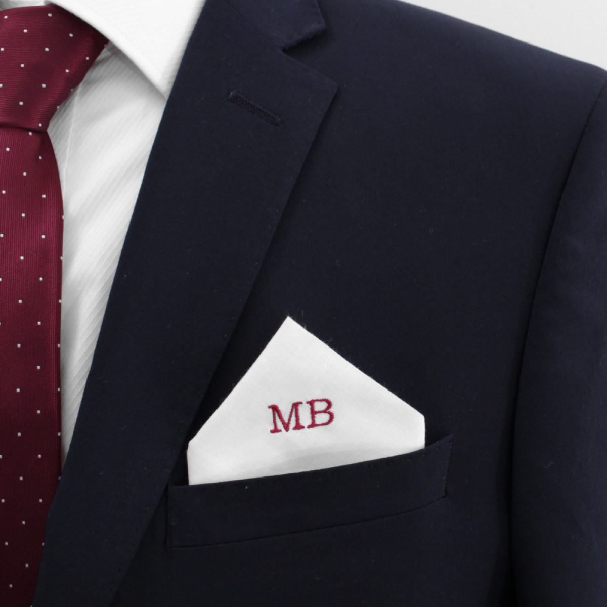 White cotton pocket square classic handkerchief with monogrammed placed for display in a top jacket pocket.